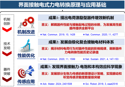 面向智能科学领域对可持续供能和高灵敏传感技术的迫切需求,研究聚焦于界面接触电式力电转换原理及微能源与传感技术。揭示了材料界面接触电荷转移与电信号形成机制,首创了电荷自激励方法与自极化复合接触电材料,研制出具有世界纪录级别力电转换性能的器件,被国际同行评价为“首个实现高性能输出的器件平台”;发现了界面接触力-电饱和本构效应的科学现象,发明了仿生微腔增强型接触电式力信息感知器件,显著提升了传感灵敏度,成果被认为“对改善可穿戴传感信号产生策略具有重大意义”;在智慧电网领域,开发了基于微风流致振动的取能-传感一体化装置,突破了输电线路状态可持续监测的关键技术瓶颈。
