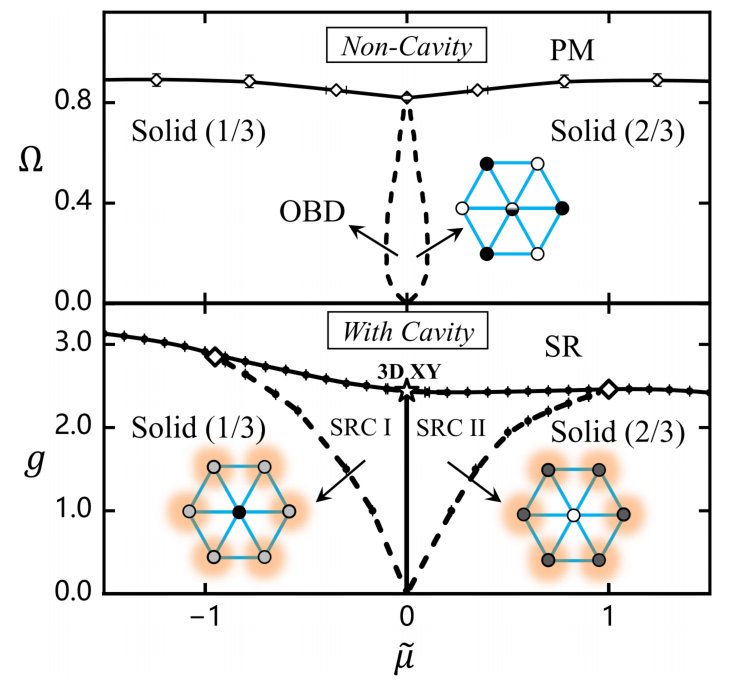 本研究创造性地将这两个前沿方向结合,探索了放置于光学腔中的三角形里德堡原子阵列。理论计算与大规模量子蒙特卡洛模拟表明,一旦引入量子化的光场(腔模),整个系统的基态性质就被彻底改变。原本在经典光场下可能出现的、由“无序致有序”机制产生的、具有六重对称性的“钟”序相(clock phase)变得不稳定。取而代之的,是一种全新的“超辐射时钟相”。该物态同时承载着两种序:一是超辐射序(对应U(1)规范对称性破缺,即光与原子处于宏观相干态),二是空间密度波序(对应于平移对称性破缺,里德堡原子呈现周期性密度分布),形成了独特的“两序共存”现象。